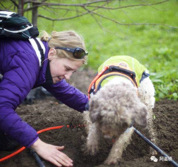 这个姑娘带着猎犬搜寻白松露。它们散发出的气味持续时间有限,通常只有训练有素的猎犬和经验丰富的猎人才能发现它们的踪迹。白松露只生长在森林地区并且无法人工养殖。