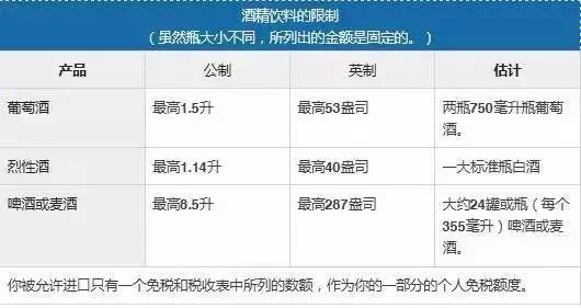 指超过0.5%的酒精度的产品。以下是你允许带入加拿大的酒精和酒精饮料的数量(之一):如果你携带入境更多的酒精饮料,将需缴纳关税和税金。