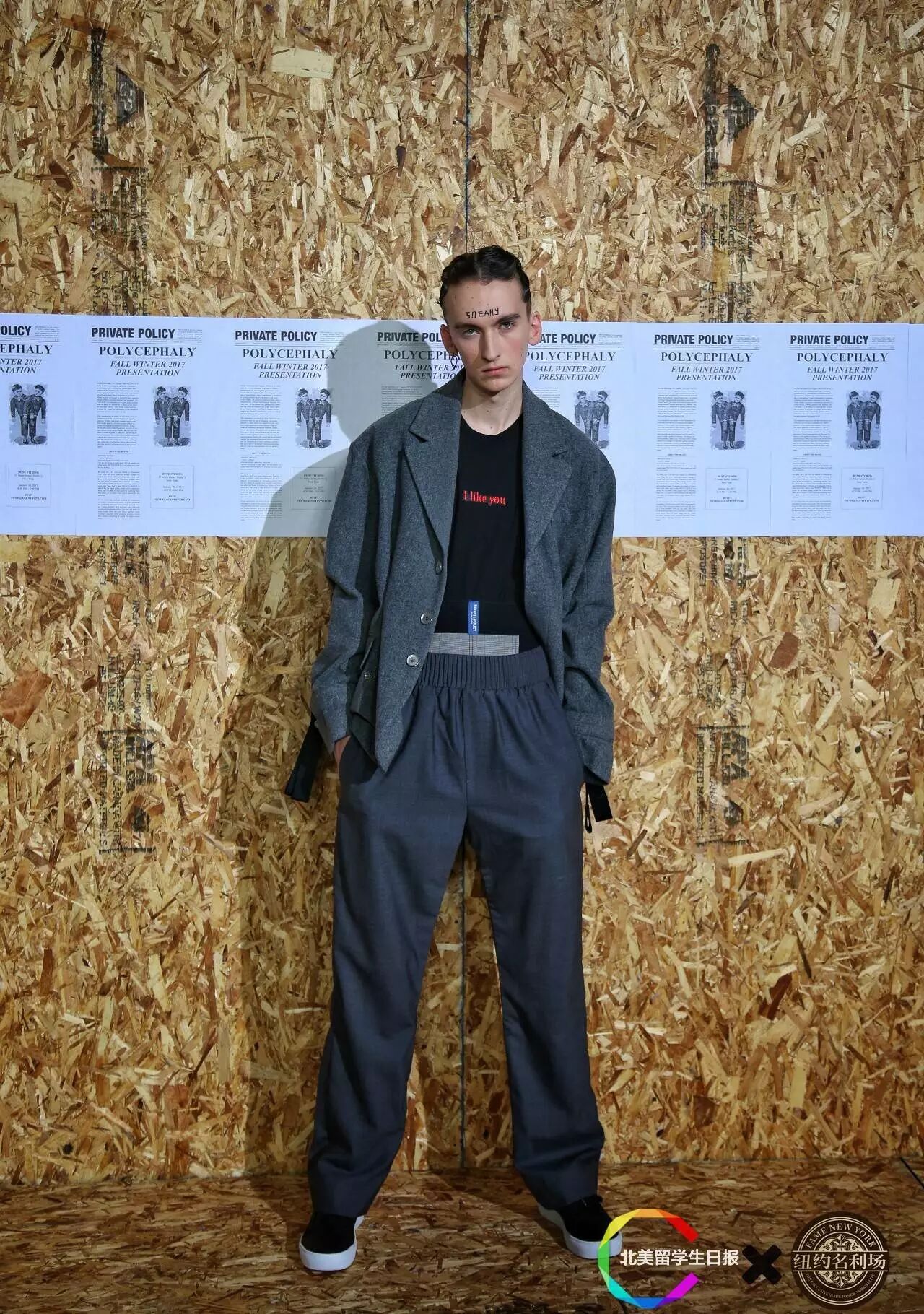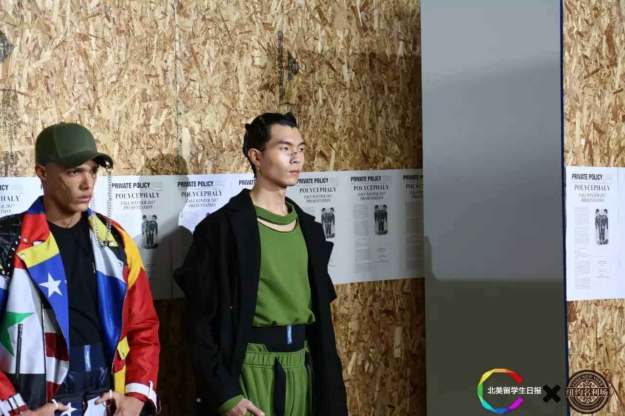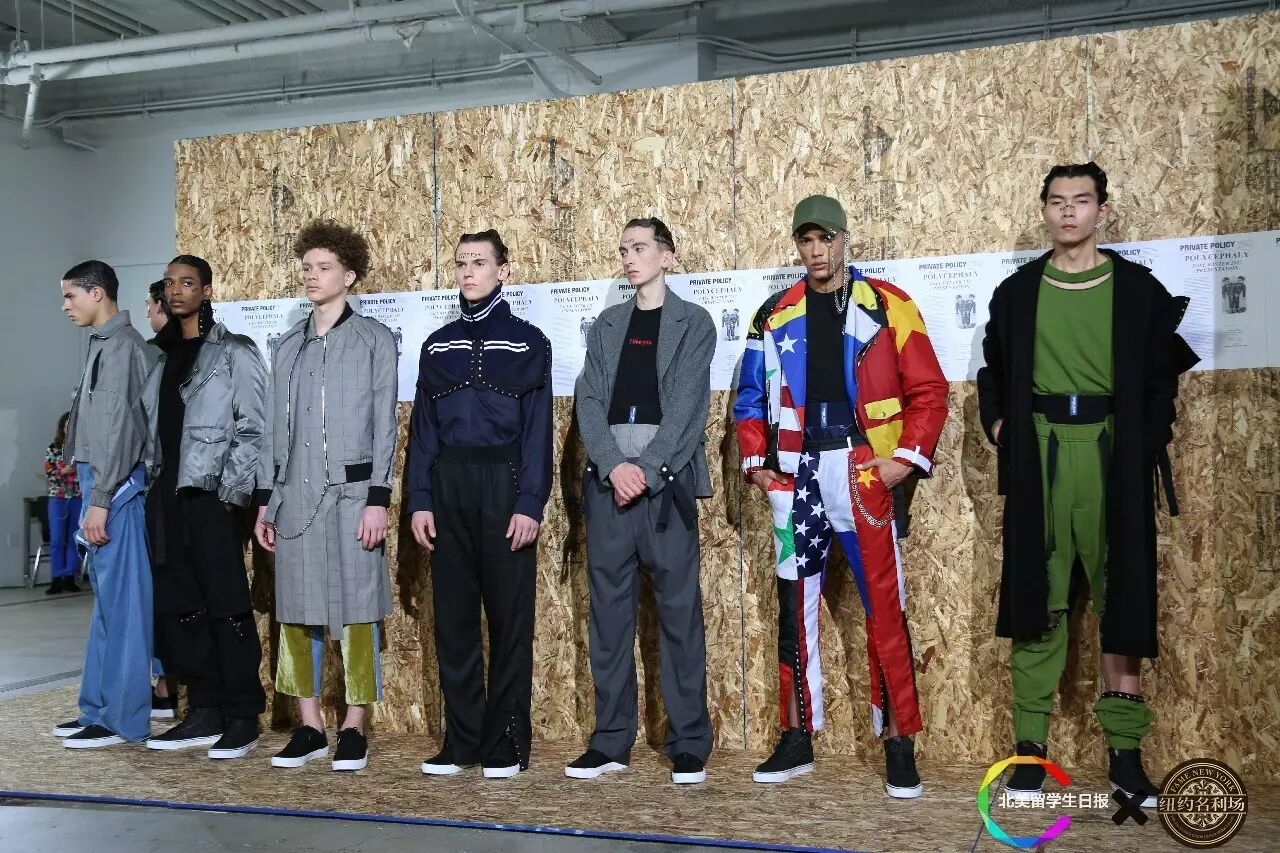 ! a$ {8 H6 u. g+ @3 y; s纽约男装周的这场presentation的确也了我们不少惊喜,除了有不少亚洲男模,还有两位纽约最顶尖的设计学院Parsons毕业的华裔设计师李浩冉和瞿思颖所设计的品牌Private Policy,这一季就很应景地结合了当前国际政治形势。