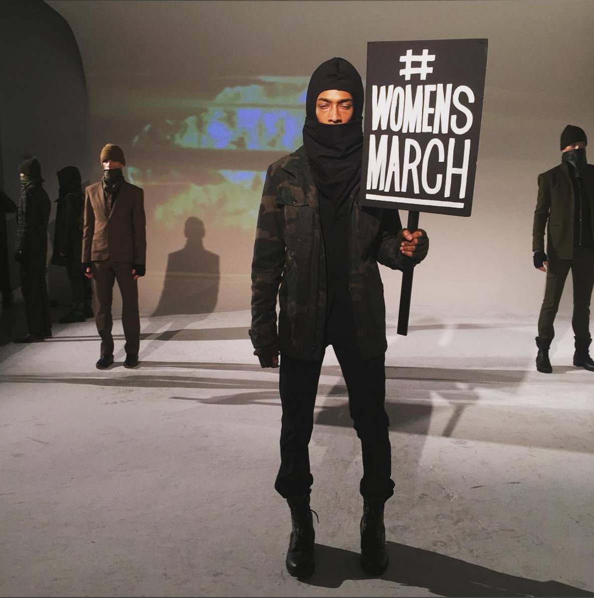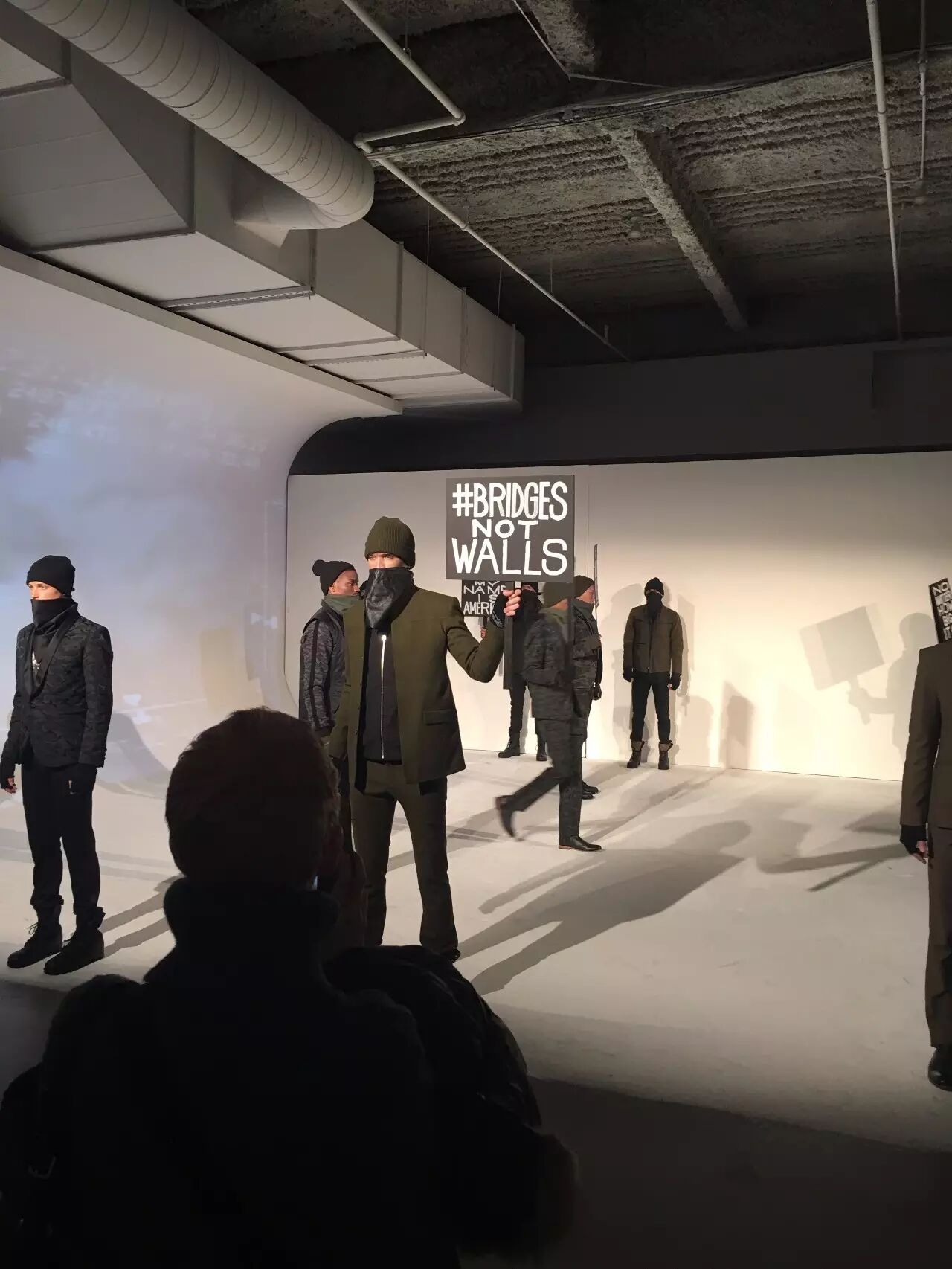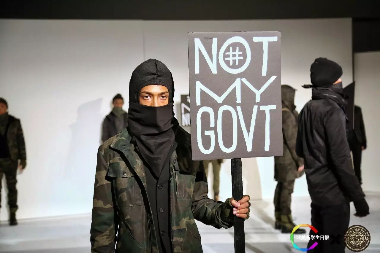 ; I$ y# |% {, I不仅仅是Private Policy,由于此次时装周举办时间的特殊性,很多设计师都会从当前的政治形势中获取灵感,纽约设计师Robert James的品牌By Robert James此次直接把自己的presentation做成了一场抗议活动,