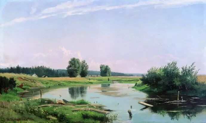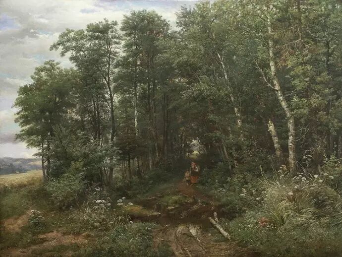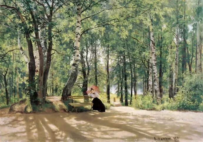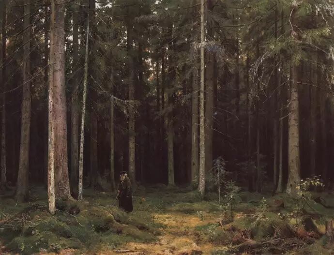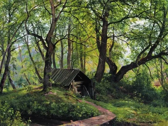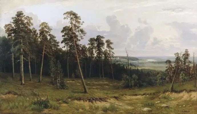 希施金的风景画多以巨大的、充满生命力的树林为描绘对象,那些摇曳多姿的林木昂然挺立,充满生机。繁木菁林,疏密有致,大森林的美与神秘,被渲染得淋漓尽致,可谓美不胜收。希施金所描绘的林木,无论是独株,还是丛林都带有史诗般的性质。林木的形象雄伟豪放,独具个性,显示出俄罗斯民族的性格。