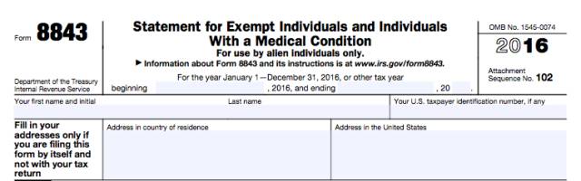 Form 8843即是F-1留学生向IRS提交的一份个人资料表,通过表明自己的F-1身份来证明未通过实际居留天数测试,最终达到税款豁免的目的。