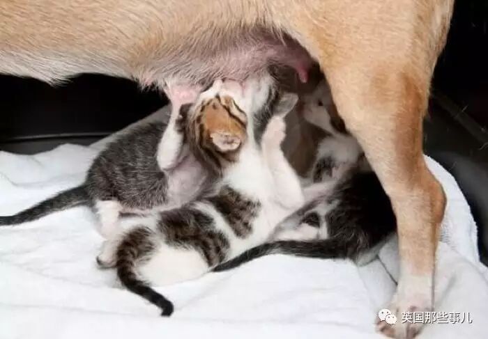 狗狗当起了猫咪们的妈妈,正在给它们喂奶...