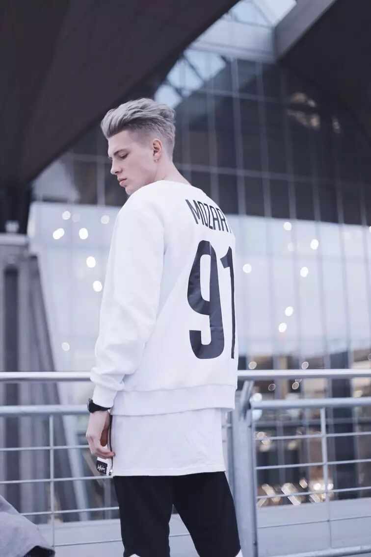 % b6 }3 O6 A' m* E( h卫衣内搭白T恤,里长外短的搭配方式可营造层次感: