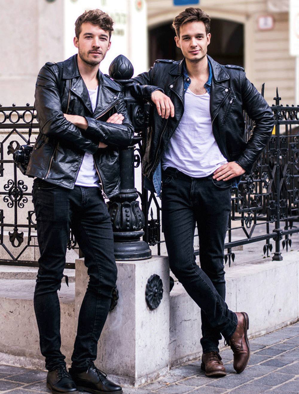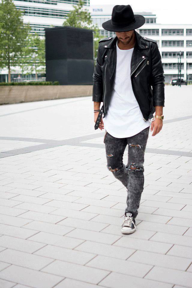 搭配修身的黑色皮衣,既呈现出男人味的一面,同时兼具清新阳光的气质: