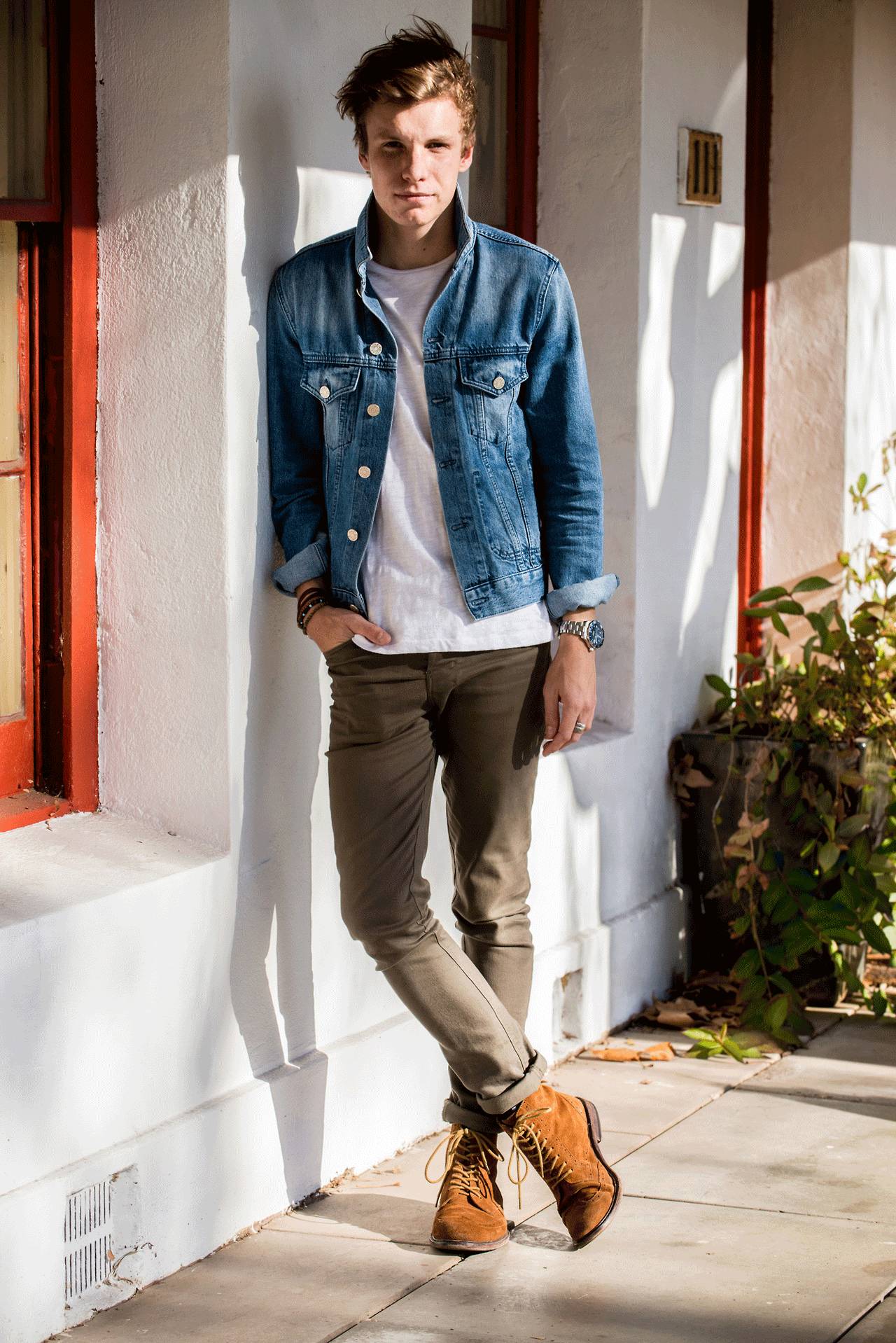 硬挺的牛仔外套搭配绵柔的白T恤,这就是刚中带柔的直男典范: