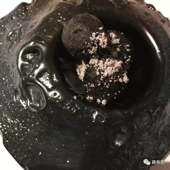 确实是个名副其实的黑!球!其实它是炭包裹着金枪鱼做成的一道炸丸子,范主觉得这道菜和它的菜单表情简直神同步~
