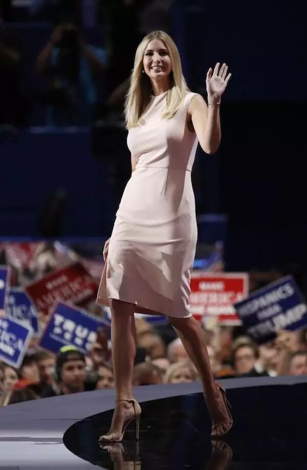 ▲在共和党全国大会上发表关于儿童保育税收抵免和产假政策的演讲后,伊万卡在推特上发布了“点击这里购买我的裙子”。这条138美元的裙子当晚售罄。讽刺的是,不久后她的公司被曝出克扣员工产假福利。
