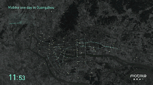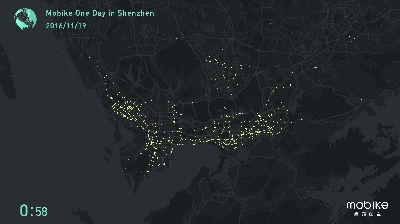 下面这张动图,是摩拜在深圳的一天。深圳是个不眠之城,凌晨两三点都有很多人在骑摩拜。