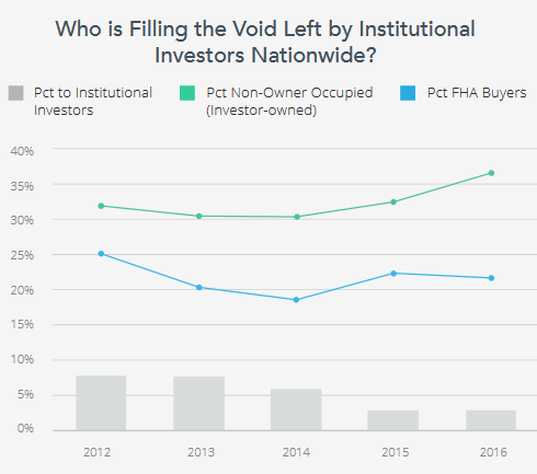 在2013年第三季度期间,机构投资者买入了占房地产供应量7%的房屋。在2013年第一季度,其持有的房屋数量一度曾达到9.5%。随着后来房价的飙升,很少有不良资产房屋被赎回。到2014年时,当房地产价格上涨至历史新高水平时,这些大规模购买并出租房屋的计划开始面对高额的结构性费用,而且投资表现也越来越差。此时,这些大买家又开始变成了大卖家。在2016年时,这部分机构投资者手中持有的房屋数量,又开始降低至占总体购房人数2%的水平。