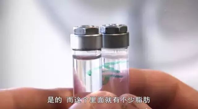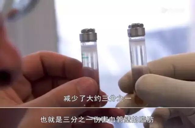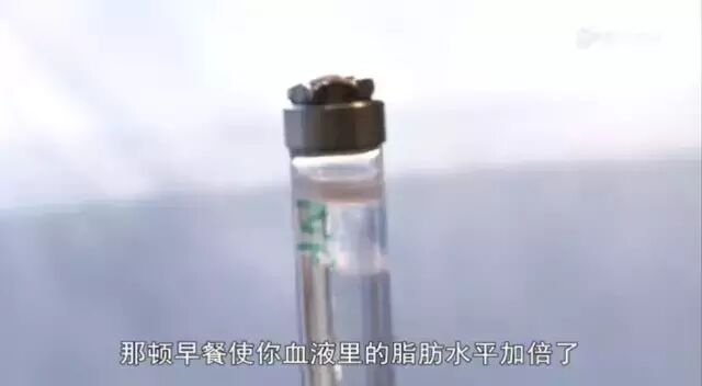 跟吃早餐前的血液样本一做对比,就能很明显看出右边试管里的脂肪层更厚。