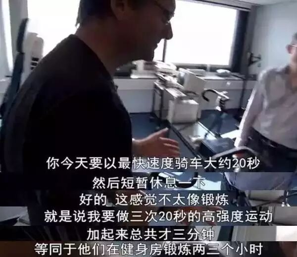 Mike以自己的极限速度骑单车20秒,短暂休息后继续,每次三组,每周做三次训练。实验证明,这种锻炼方式所能带来的健康益处,等同于在每周在健身房中锻炼两到三个小时。