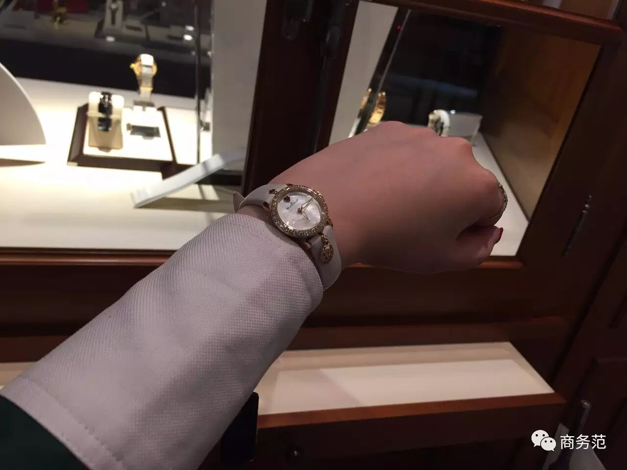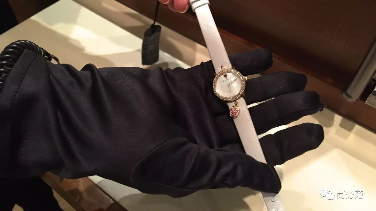当范主问起那只心水的LadyBird,店员直接用门禁打开展示橱窗,拿出来让范主进行试戴。