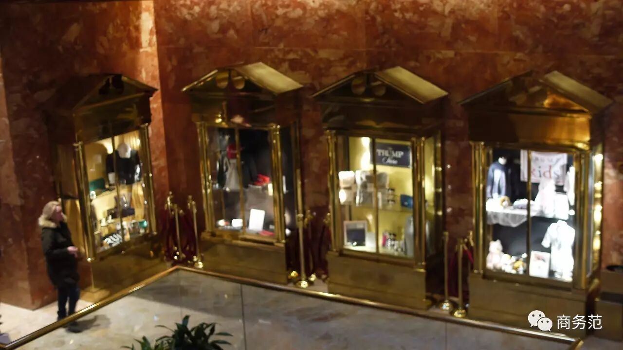 ' K, B5 u r, s2 O1楼自恋式地摆了四个金色的大展示柜,里面陈列着各种川普同名品牌的衣服和家居用品。