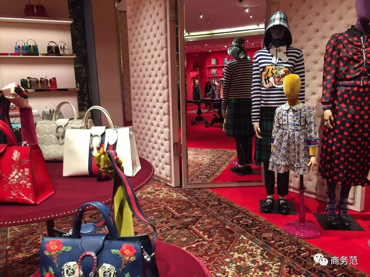 2 R/ A0 ?1 Z2 g. q店里的装修很Gucci,色调粉红粉红的,又仙又文艺,整体风格跟北京SKP的店很像。包包的款式很全,能买到不少秀款。
