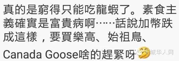 2 U, ^& V2 T# a! c: j ?* a" K0 b( i 对于前一段抱怨各种肉价大涨要改吃素的加拿大人,我只能呵呵了。这位网友说的好,素食主义可是富贵病哦。话说加币跌成这样,要买始祖鸟、加拿大鹅啥的赶紧吱声代购啊,过两天可就不知道是什么价了。