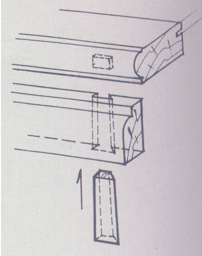 是在两顺向木材之间凿眼垂直栽上的薄方木片,以联结固定二者间的位置。如在桌面心板之间,床牙板与大边之间等等。