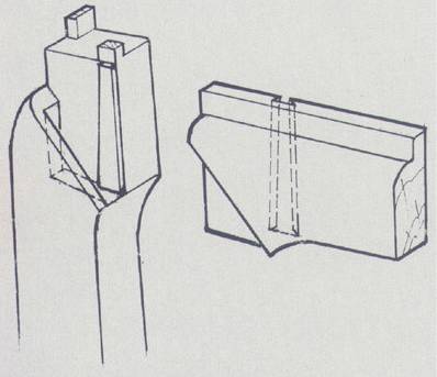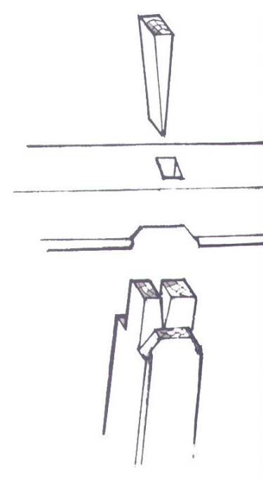 楔是一种-头宽厚,一头窄薄的三角型木片,将其打入榫卯之间,使二者结合严密,榫卯结合时,榫的尺寸要小于眼,二者之间的缝隙则须由挤楔备严,以使之坚固。挤楔兼有调整部件相关位置的作用。