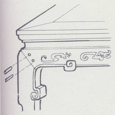 是在栽销的基础上,使销子延长并通透于其一板材的中心,多见于大型的铁力、紫檀等床案厚重的牙板与大边的拍合,十分坚固。