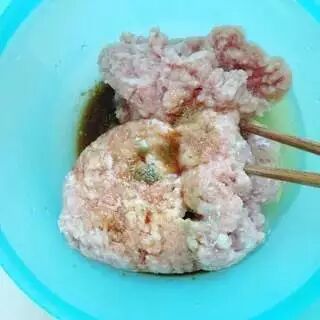 2.先往肉馅里放入少许香油,然后朝着一个方向搅拌