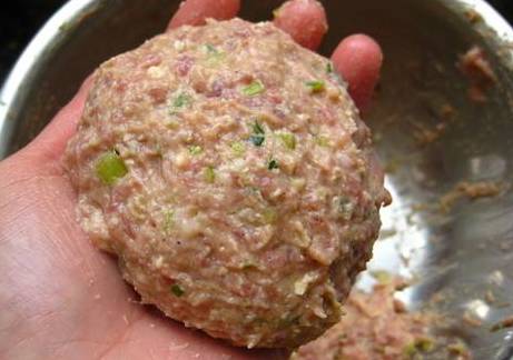 5.用手掌来回摔打几次肉馅,然后再将肉馅做成一个个拳头大小的丸子
