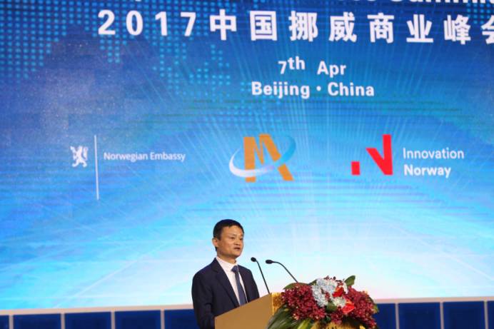 # C; T& v# G+ ^8 I1 o图:阿里巴巴集团董事局主席马云在2017中国挪威商业峰会上做主题发言