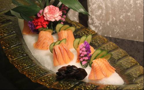 色泽橙黄剔透的鱼肉,闪着银色柔光的鱼腩,被切成大小厚度适中的片状,摆放在铺垫着雪白萝卜丝的器皿上,只要些许芥末与酱油,就能让味蕾得到最恣意的绽放。