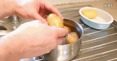 第三步:取出土豆在冷水中浸泡5秒,这时,轻轻一剥土豆皮便去掉了!