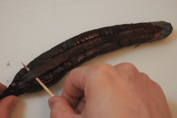 第二步:取出茄子,此时准备一个牙签,轻轻一刮,茄子皮就去掉了!