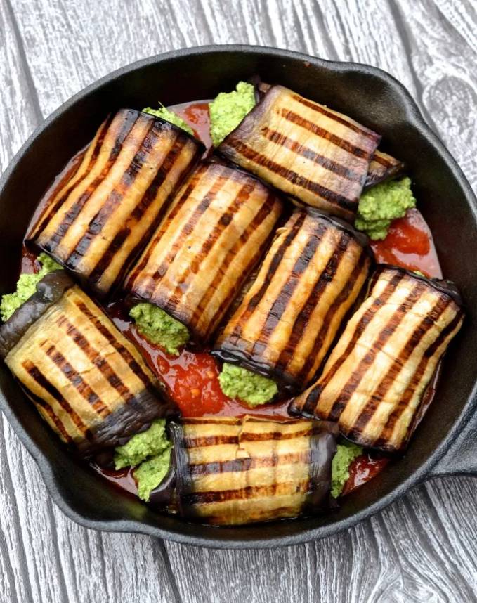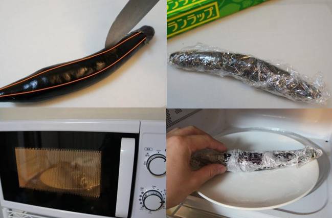 第一步:在茄子表皮上每隔2cm左右轻轻划几刀,包裹上保鲜膜放入微波炉加热5分钟。