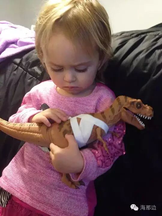 ▼电影《侏罗纪公园》刚上映的时候,我给女儿买了这个身上带有伤痕的恐龙玩具。很多人说这太暴力,不适合小孩子。然而我两岁的女儿让我帮她给受伤的霸王龙包扎伤口,并抱着安慰它。