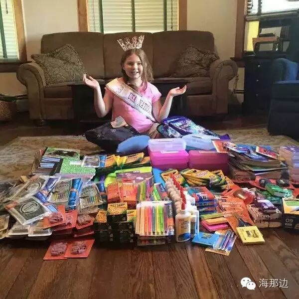 . v4 w3 w6 P% i* L8 L▼Mackenzie用两次义卖得到的500美金买了很多文具给那些需要文具的小朋友。