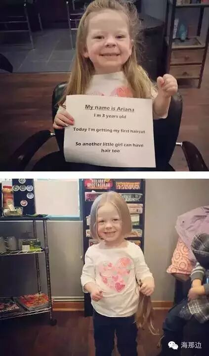 7 j8 s6 Y/ G: d7 `. Y4 R' \3 h. _▼我三岁的女儿看到一个没有头发的女孩问我她为什么是光头。我向女儿解释说因为化疗让她的头发掉光了。然后女儿说:“她可以用我的头发。”