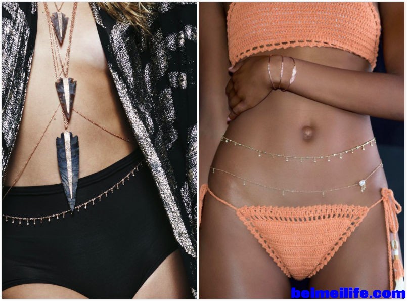 & w1 O- O$ u) @2 H F 这个之前也有介绍过,爱美之心的驱使下出现了各式各样的可能,胸链在穿着清凉、低胸装时候起到点睛之笔的作用,腰上戴着的姑且叫腰链吧,穿比基尼、露脐装还有这两年很火的“露胃装”都再合适不过,甚至大腿呀、脚腕啊、手臂这些地方都能买到装饰的首饰。