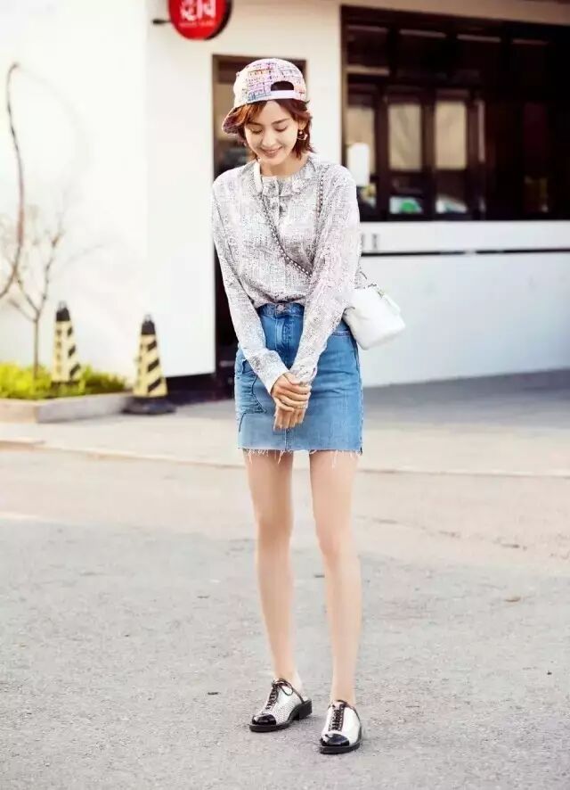 ▼带有毛边和分叉的牛仔半裙给人一种更时髦更有态度的感觉,给Look增添了时尚元素,更生动。4 A6 h- V2 o$ M4 ^' |8 Y