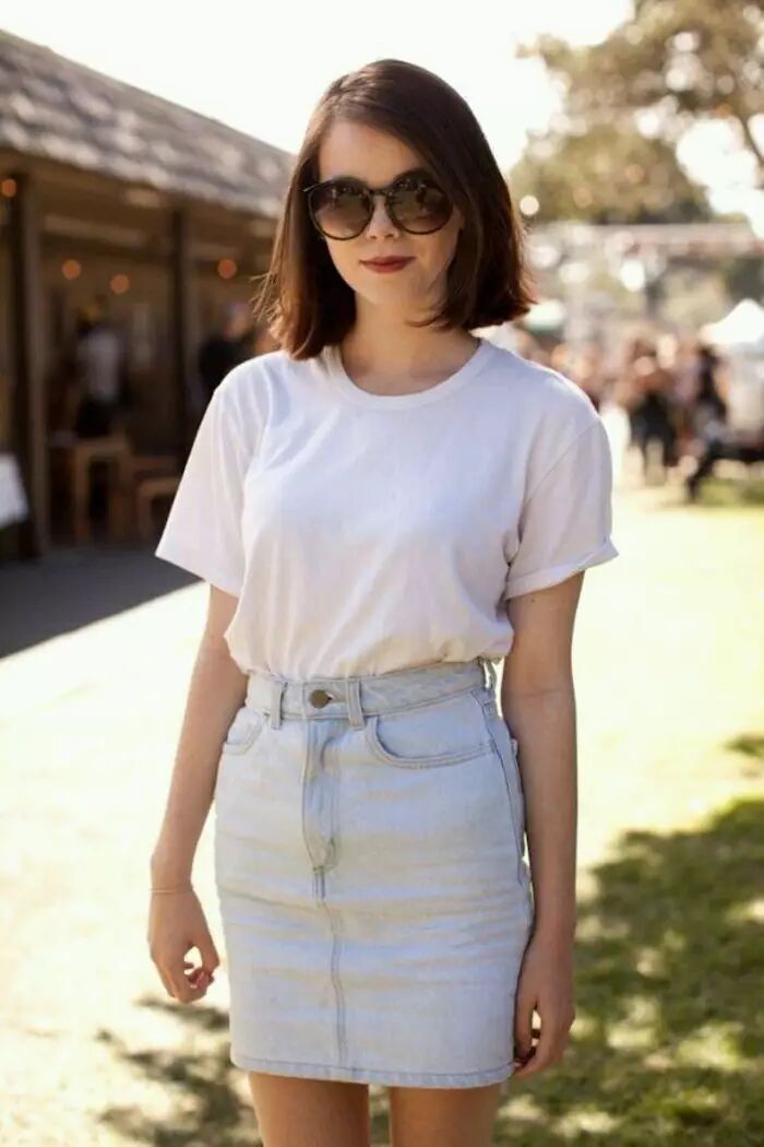 $ }+ _6 I, U: C K! U▼想要抓人眼球又不会过于刻意凹造型,图案Tee+牛仔半裙可以考虑列入穿衣清单。最好T恤上含有一个及多个亮色助攻更出彩。
