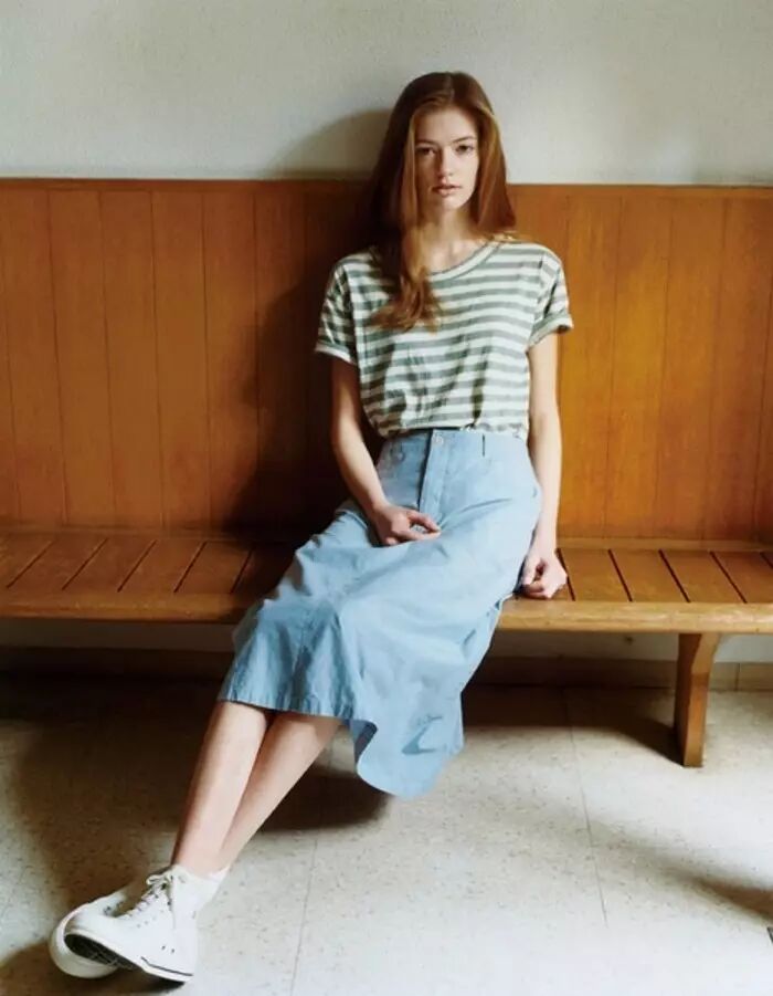 Tee+牛仔半裙,想必每个姑娘都或多或少尝试过这样的搭配组合。一件基础款纯色牛仔裙,可以将各类流行T一网打尽,Logo T、条纹款甚至赛车画风的印花T都能毫无压力尽收囊中;字母T+刺绣半裙的元素对撞更添吸睛资本。! L7 Y" `7 c& q- n# n1 D7 ^5 l