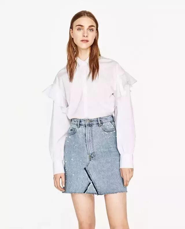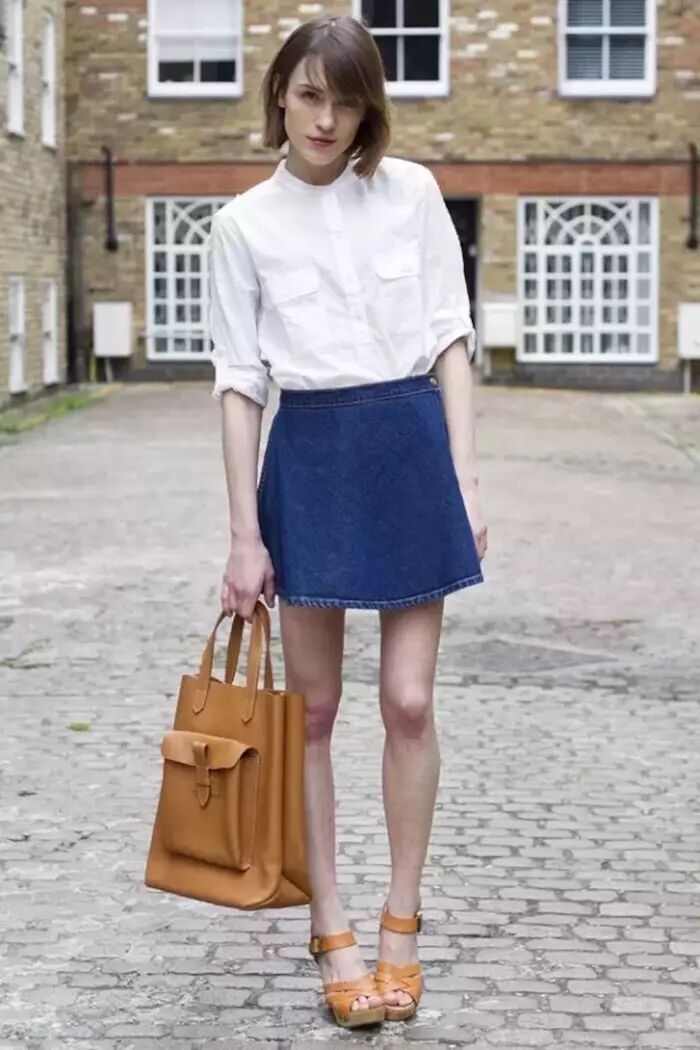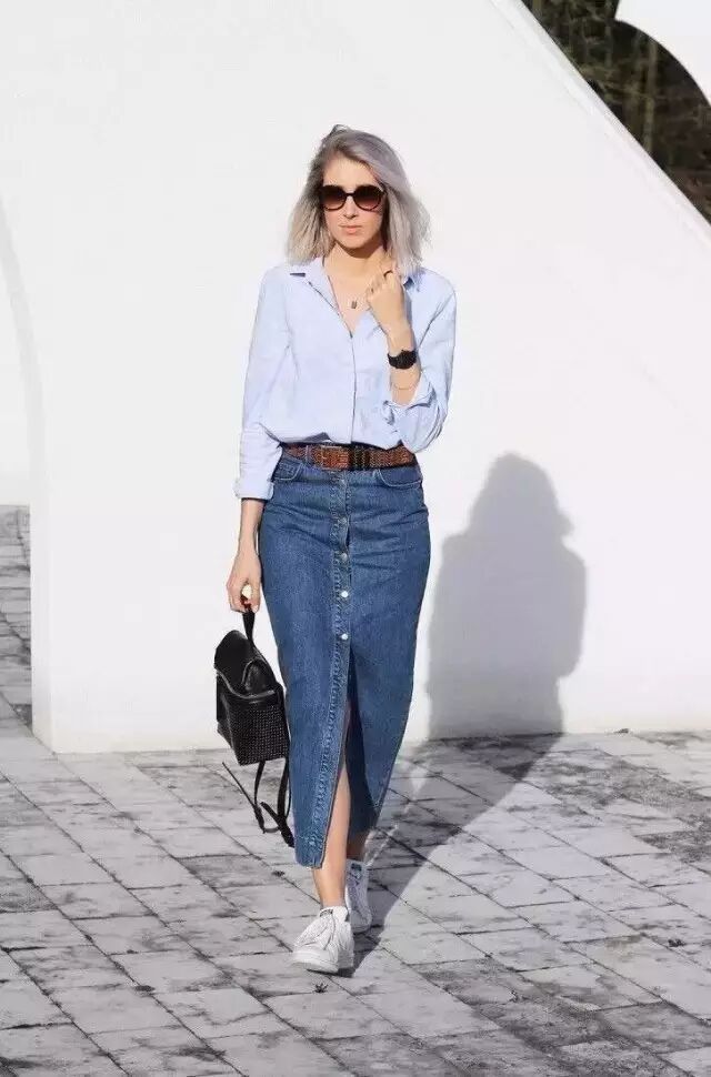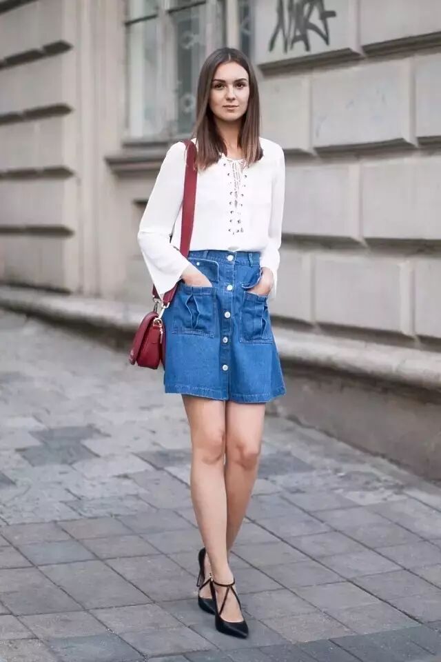 ▼同样是白衬衣+牛仔半裙,选择今季热门的前系带衬衣,与牛仔布的“民族”气质相吻合,休闲搭配也能够很精致。