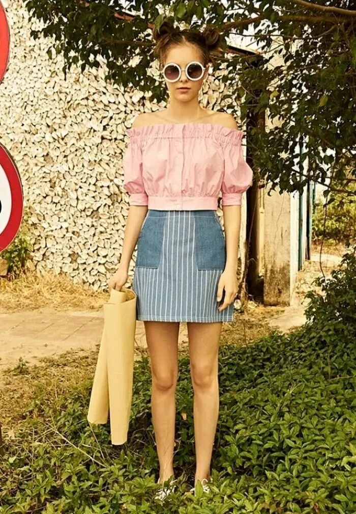 ▼牛仔裙的中性元素可以平衡露肩上衣的性感,增加度假feel,非常适合平日出街穿着。