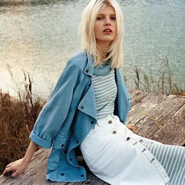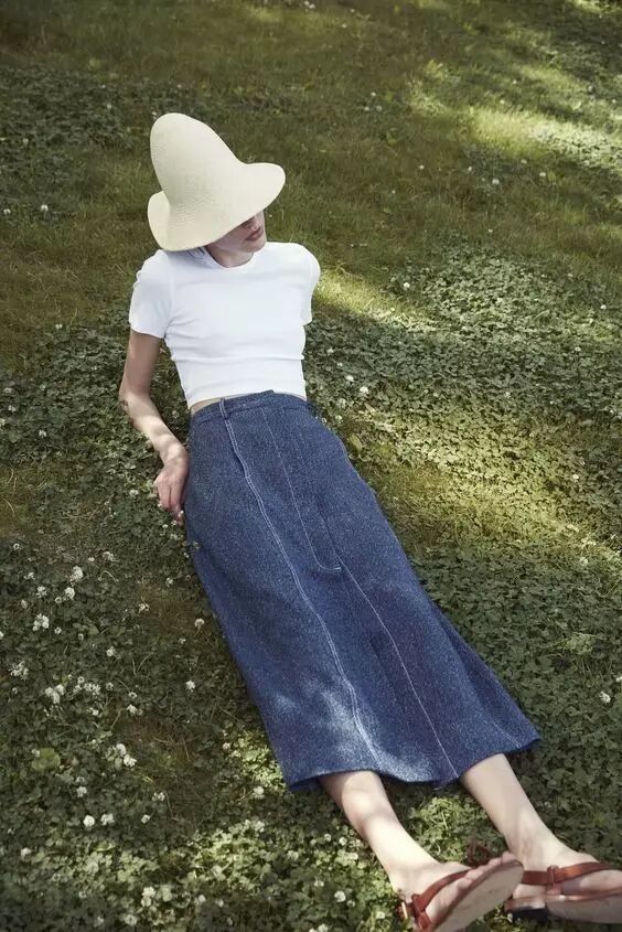 牛仔与牛仔擦出的火花中,要数牛仔上衣+牛仔半裙最为柔和,裙装中和牛仔的中性与攻气,却保留穿搭小个性。上衣塞入半裙中,是对穿搭比例最基本的尊重,也是长款半裙不埋没长腿的关键。! q. m; Z" b4 P! b+ _" j. a