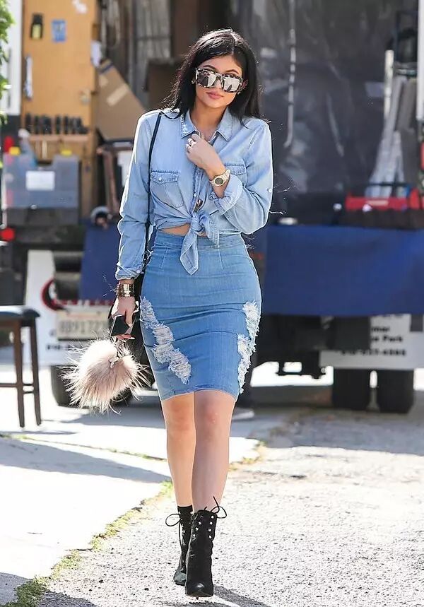 2 _& L# [& u, a, V1 V▼Kylie Jenner这套上衣系扣增加随意感,包臀的款式与系带靴搭配又显得很性感,虽然只有“牛仔”一种材质,但是风格绝不单调。