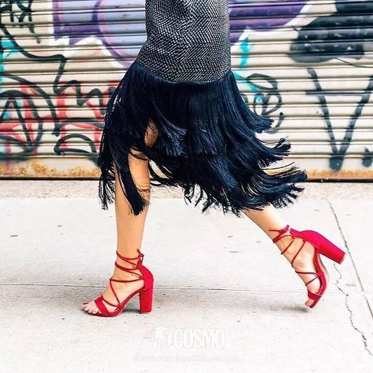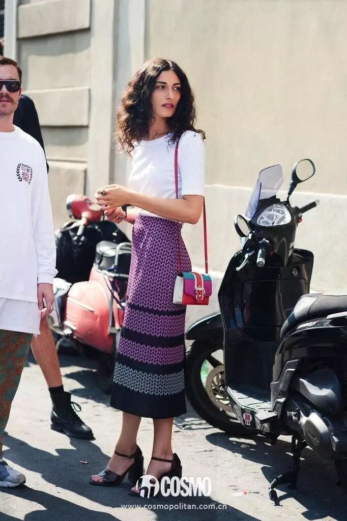 4 c$ W" {* C, p2 ~1 E# \今年半裙可以说是占据了大半边天,简单款式的、荷叶边的、金属的、还有常年都有的雪纺的,如果办公室穿半裙的话可以选择一条比较有特点的,比如裙摆很有特点,又或者是颜色比较艳丽的,搭配一件简单的白TEE或者今年很火的slogan tee就很好看。