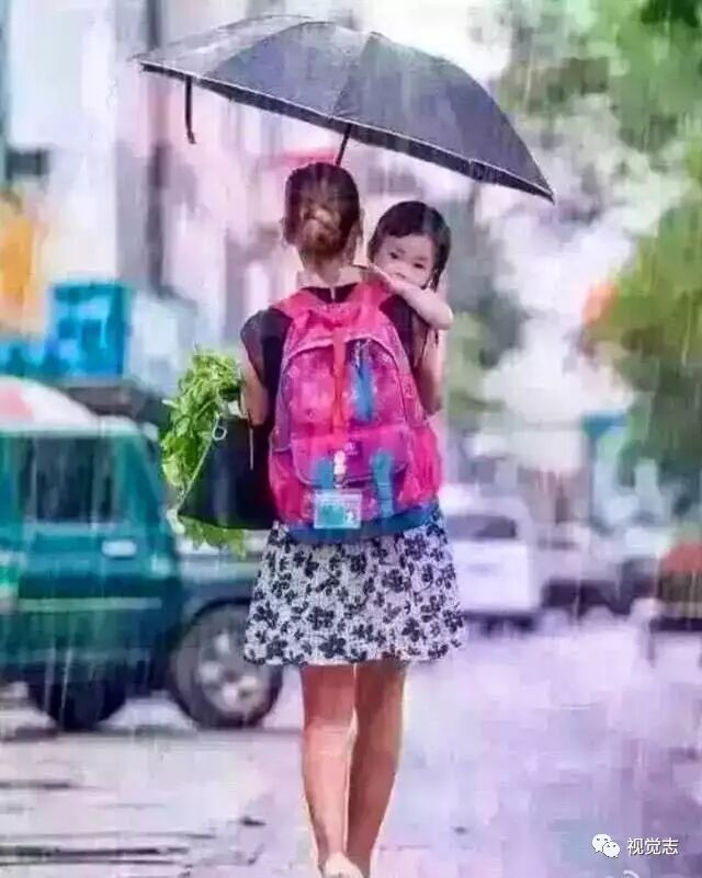 % ~( C# K# N# ]) E一位母亲下班接孩子放学。刚从市场买完菜,天下起了雨,她就右手抱起女儿,