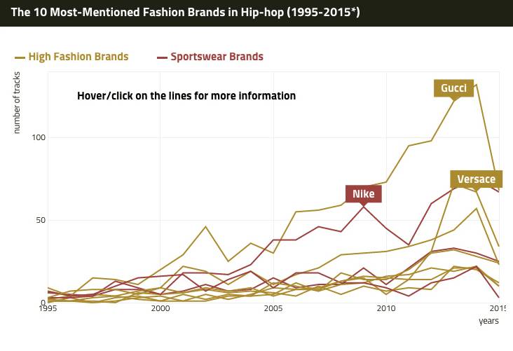 # t( w2 \/ z) Z. t9 |0 v" h& {爱用Gucci炫富的一般都是玩Hip-hop的,这可是有数据证明的:1995-2015年间,Hip-hop最爱提的奢侈时装品牌就是Gucci和Versace。