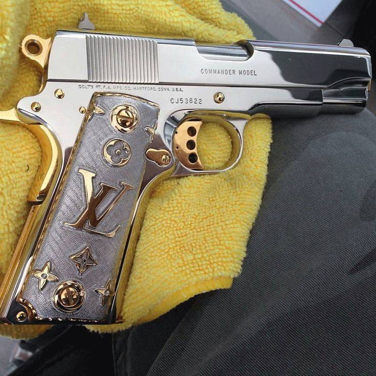 $ u& H+ o' E! O/ Z$ _) R很多外国的黑帮小哥都爱给枪贴各种奢侈品的大logo——