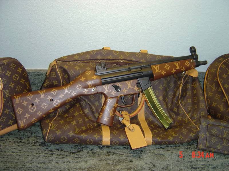 「我这些枪不大适合贴东西,但没有LV总觉得缺点底气,所以我干脆剪了两个包,给枪做了几个皮套。你别说,真挺好看。」