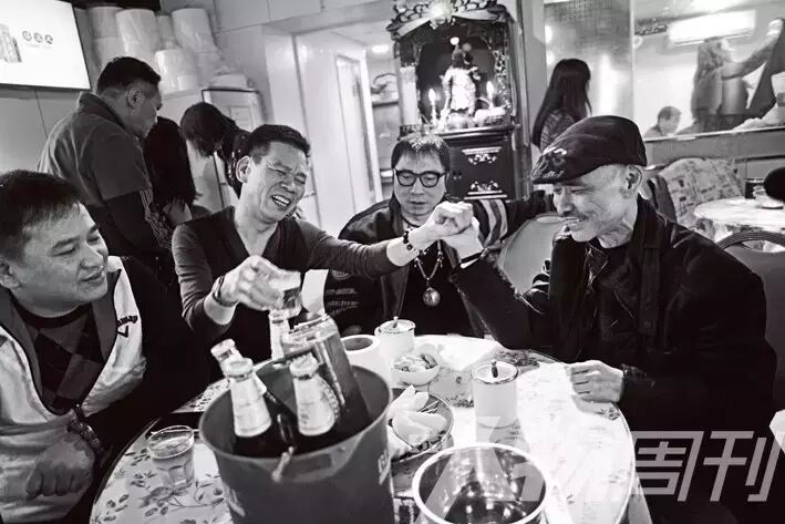 万发海鲜菜馆的楼梯狭窄,爬到二楼可见指示牌“红荃小巴”,往来红磡和荃湾的小巴司机的宴会就在这里了。到8点时,3桌分布在前中后角落里的麻将席已经人声嘈杂烟雾缭绕。酒席9点开始,那个时间小巴司机才交班。也没什么说法,菜端上来大家就动筷子。午夜12点会轮替另一班人马,再开一次宴。他们穿着帽衫、夹克,戴着粗条的金属链,喝着雪碧可乐和啤酒,直接起身越过桌面取远端的食物,桌子的转盘毫无用处。席间他们会谈论,14号“给勇哥上香”。