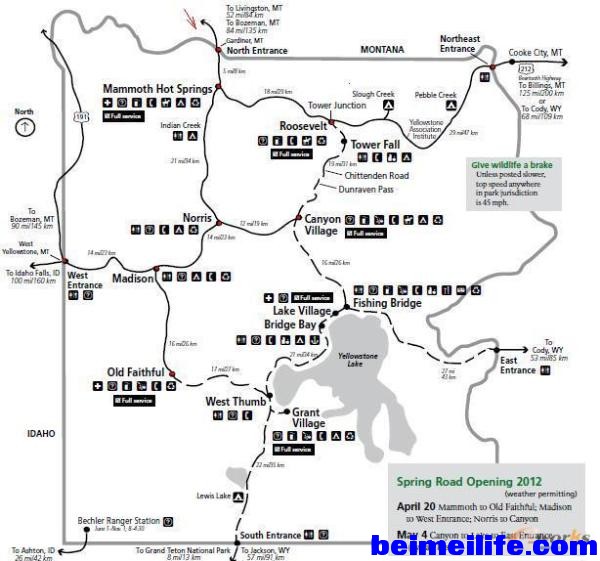 5. 黄石公园内道路狭窄,限速很低。养成注意路边警示牌的习惯。 警示牌包括限速警示牌、封路警示牌、有动物出没警示牌。白天如果 遇到穿越马路或者停留在路上的动物,应该停车等其过去,夜间的时 候应该更加注意道路上穿行的动物,不可用车灯直接照射动物。