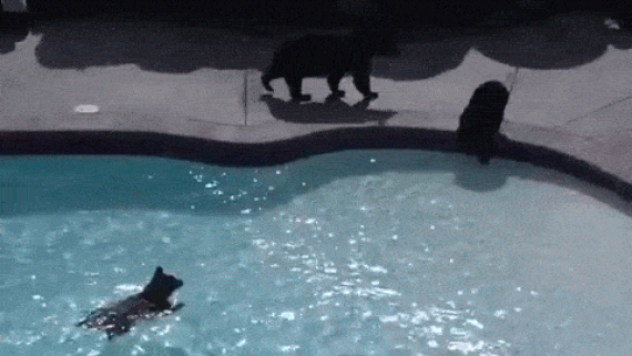 西温居民Ray Signorello周一在家里工作时,突然听到户外游泳池那传来戏水声。一开始他并没在意,以为是自己的两个孩子在玩水,过了一会儿觉得不对劲了,因为没有任何嬉笑或尖叫声。于是他抬头向外望去,看见了这一幕。。(动图,打开会有点慢哦!不过为了看萌物。。). H; u ^* H; C% N: F! [