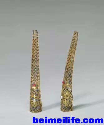 / W) `- K- V! _: W" D银鎏金累丝嵌珠石指甲套